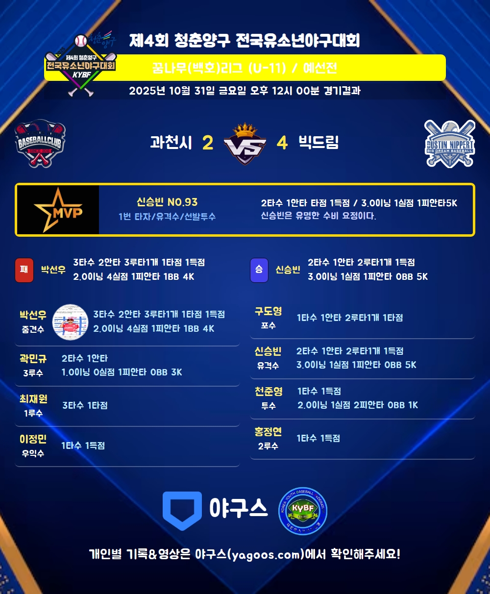 | 3 | 포 | 구도영(95) | 우희플(1타점) | - | 좌중2 | - | - | 1 | 1 | 1 | - | - | - | - | - | 1.000 |
