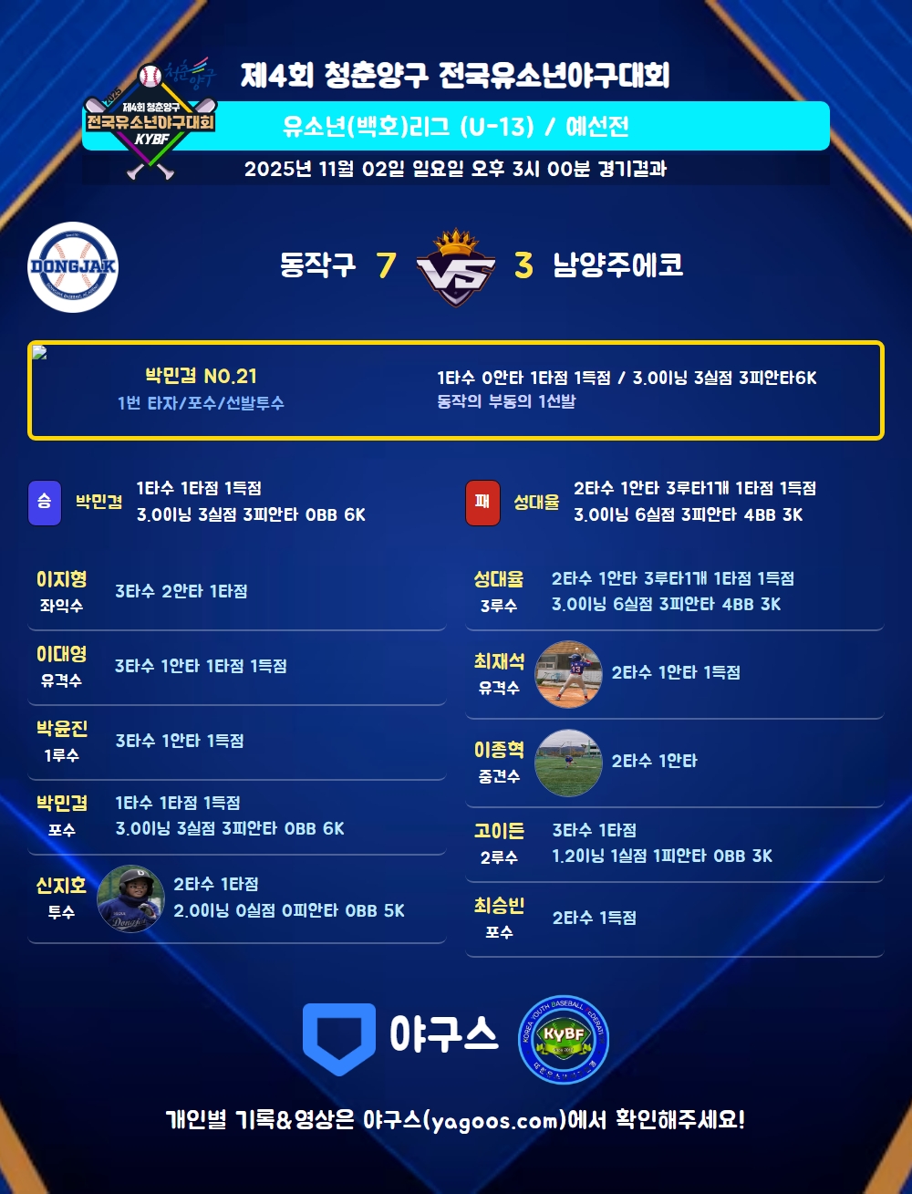 | 1 | 박민겸(21) | 승 | 3.0 | 18 | 14 | 3 | - | 4 | 6 | 61 | 3 | 1 | 3.00 |