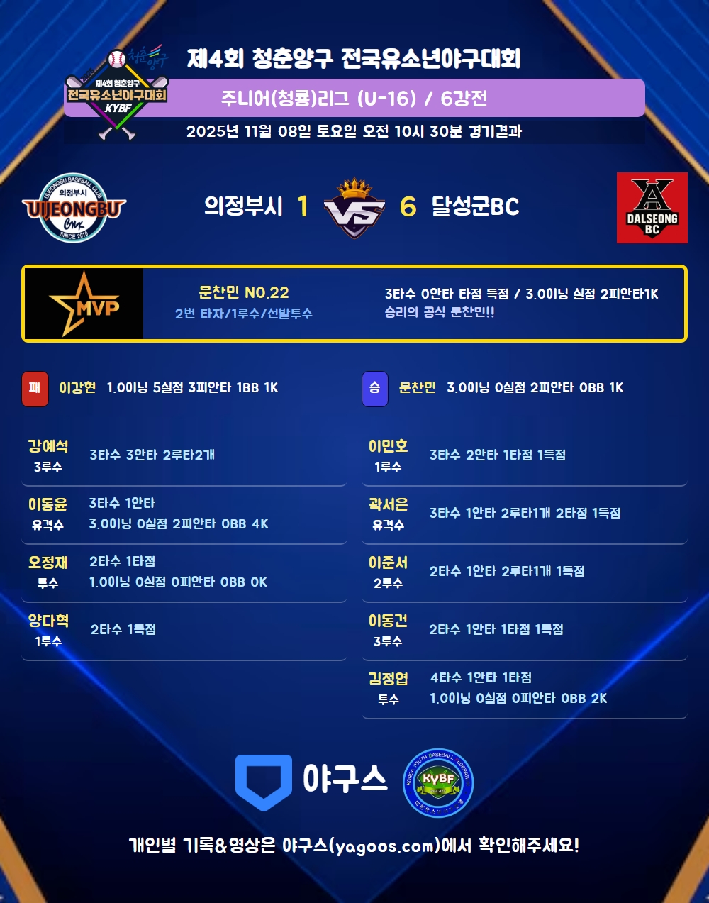 | 2 | 一 | 문찬민(22) | 좌플 | 유플 | - | - | 삼진 | - | - | 3 | 0 | - | - | - | - | - | 1 | 0.000 |