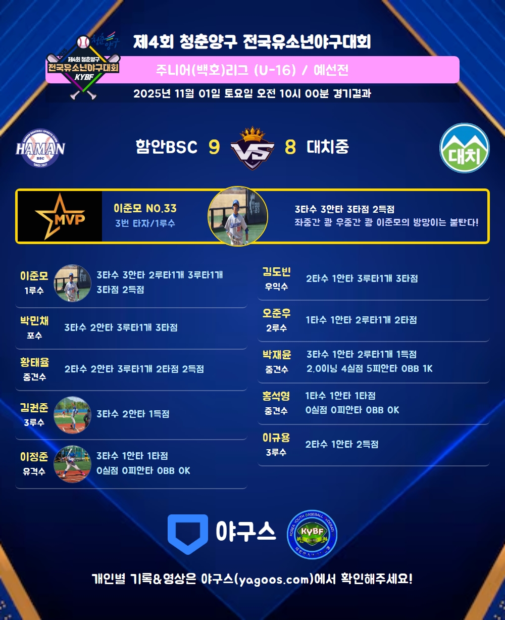 | 2루타 | 이준모(33) 박재윤(18) 오준우(35) |