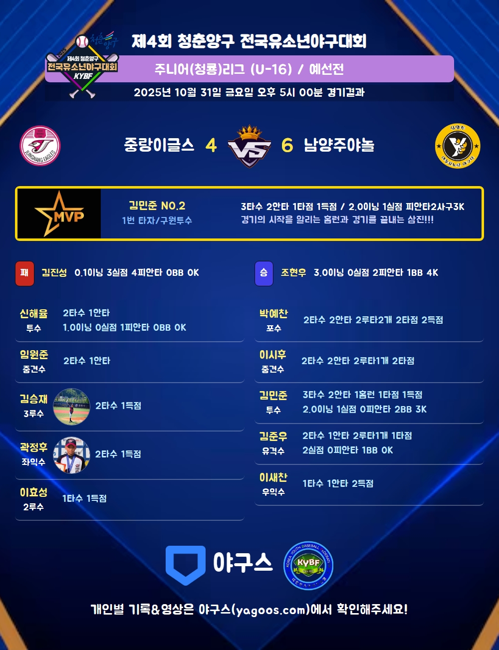 | 1 | 투 | 김민준(2) | 좌월홈(1타점) | 유플 | - | 중안 | - | 3 | 2 | 1 | 1 | 1 | 1 | - | - | 0.667 |