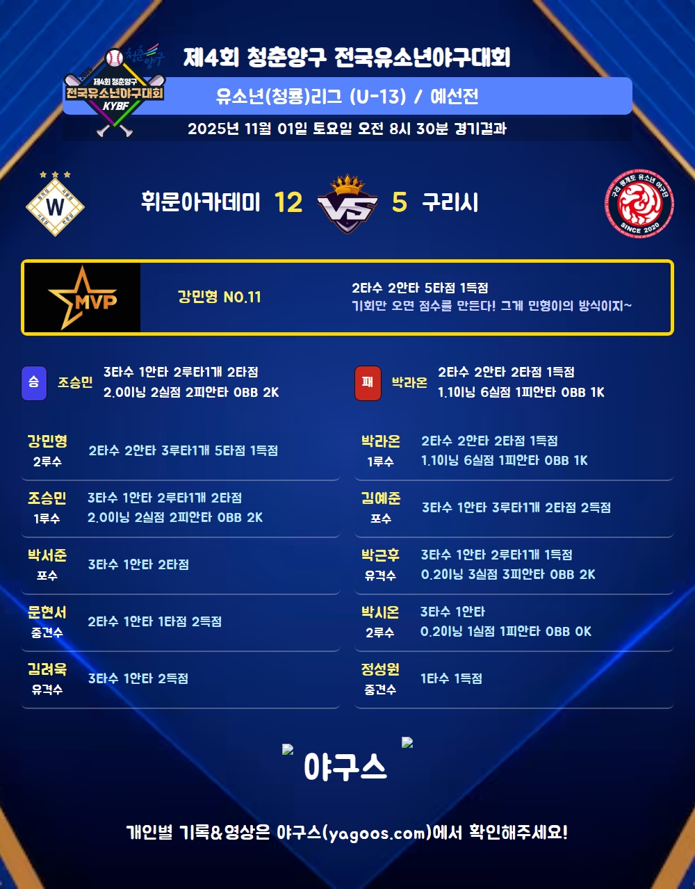 | 2 | 二 | 강민형(11) | 4구 | 4구 | 우중3(3타점) | - | 중안(2타점) | - | 2 | 2 | 5 | 1 | - | - | 2 | - | 1.000 |