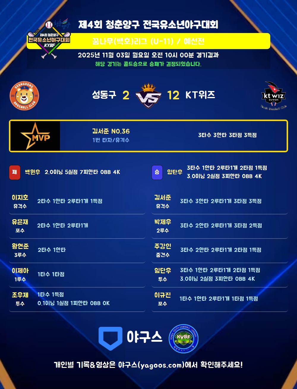 | 1 | 유 | 김서준(36) | 3내안 | 중안(1타점) | 좌중2(2타점) | 3 | 3 | 3 | 3 | - | 3 | - | - | 1.000 |