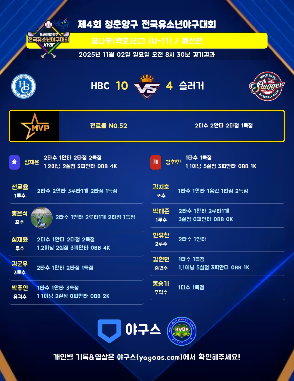 | 4 | 포 | 홍은석(53) | 1땅 | 좌전2(2타점) | - | - | 2 | 1 | 2 | 1 | - | - | - | - | 0.500 |