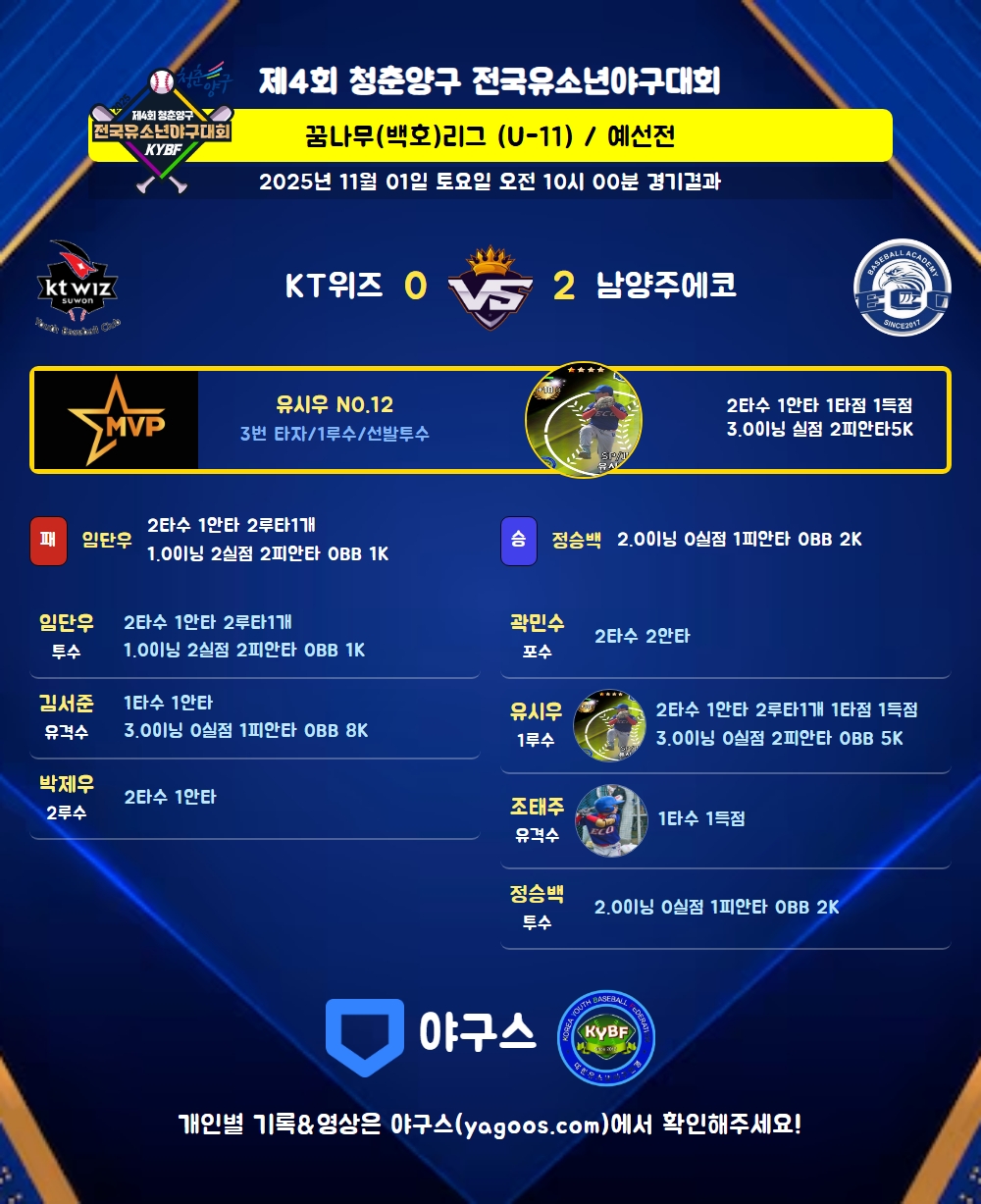 | 1 | 유시우(12) | - | 3.0 | 11 | 10 | 2 | - | 1 | 5 | 49 | - | - | 0 |