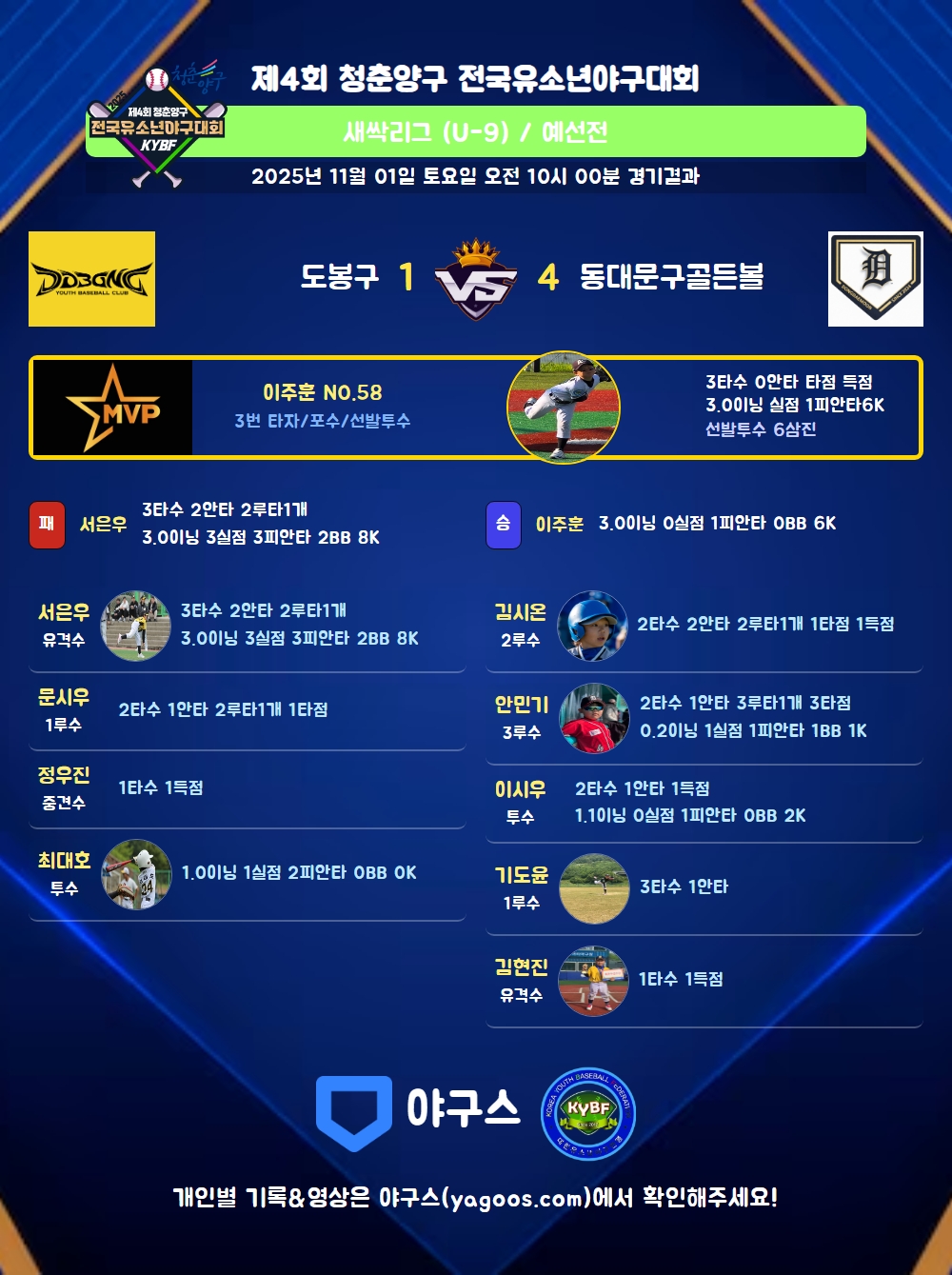 | 2루타 | 서은우(50) 문시우(21) 김시온(6) |