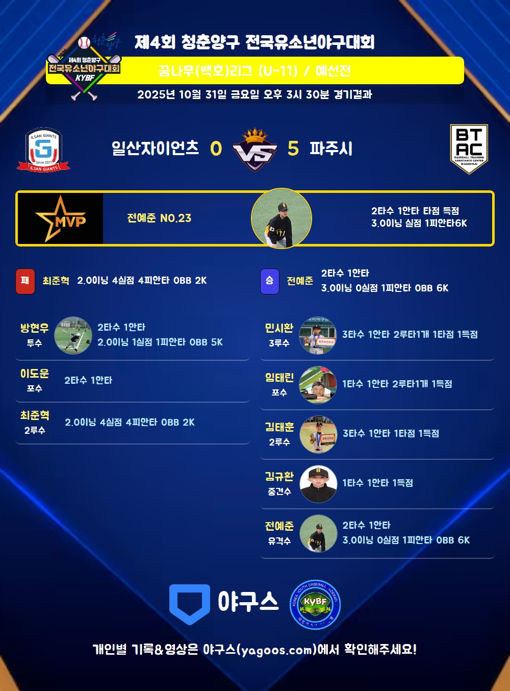 | 1 | 전예준(23) | 승 | 3.0 | 9 | 9 | 1 | - | - | 6 | 28 | - | - | 0 |