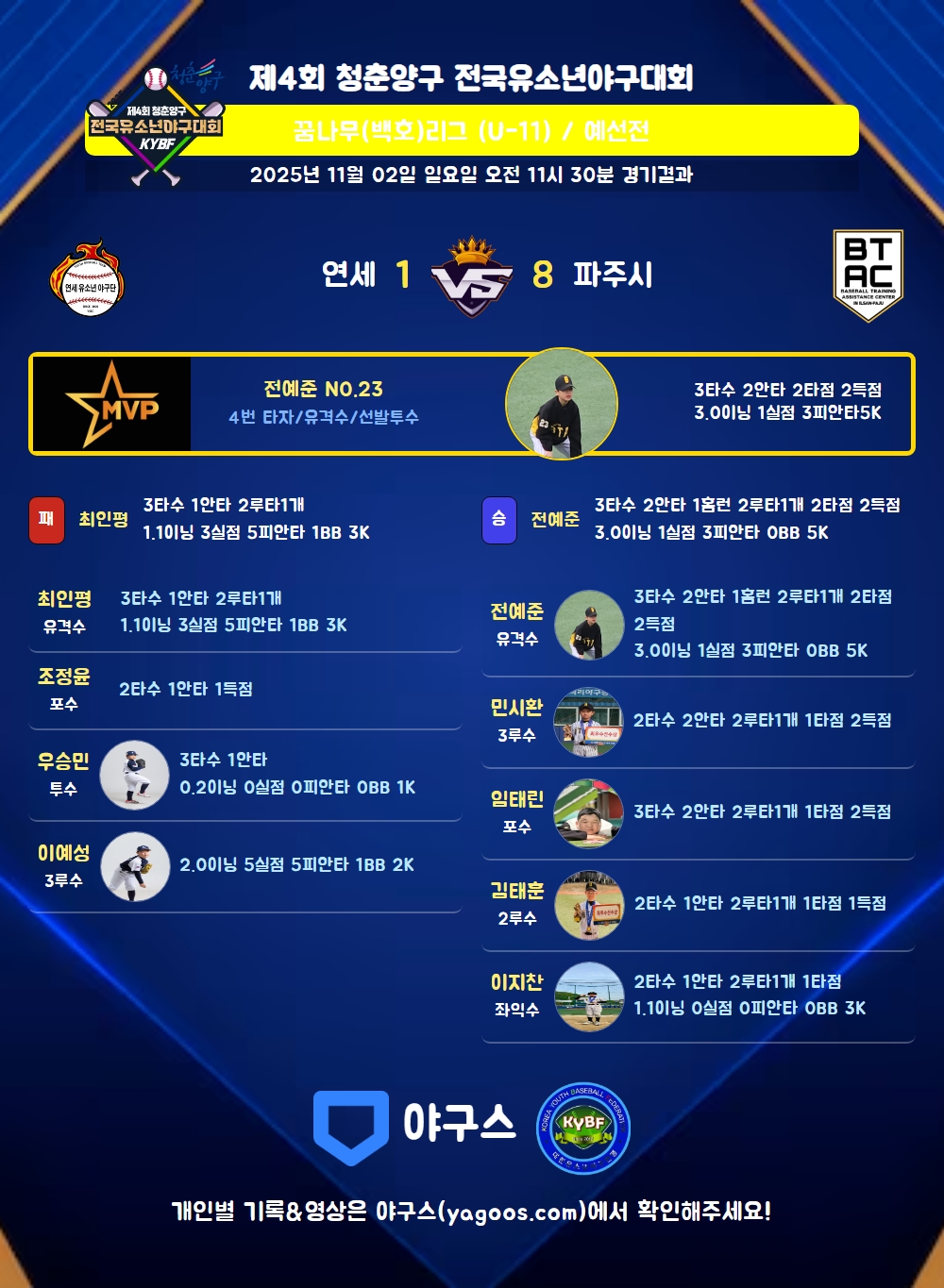 | 1 | 전예준(23) | 승 | 3.0 | 13 | 11 | 3 | - | 2 | 5 | 43 | 1 | - | 0 |