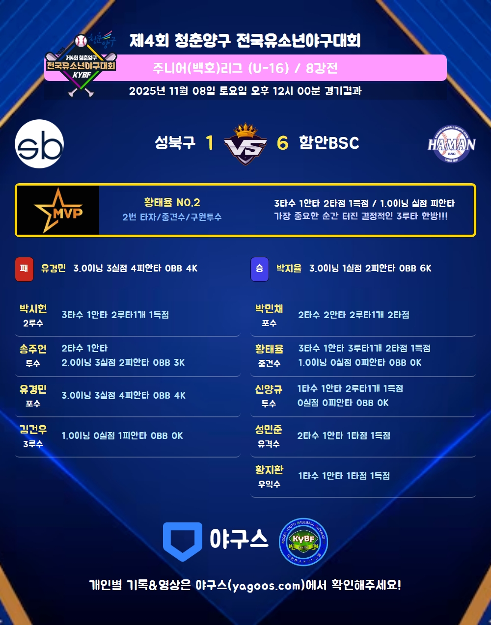 | 함안BSC | 2 | 1 | 0 | 0 | 0 | 3 | 0 | 6 | 7 | 1 | 6 | 6 |