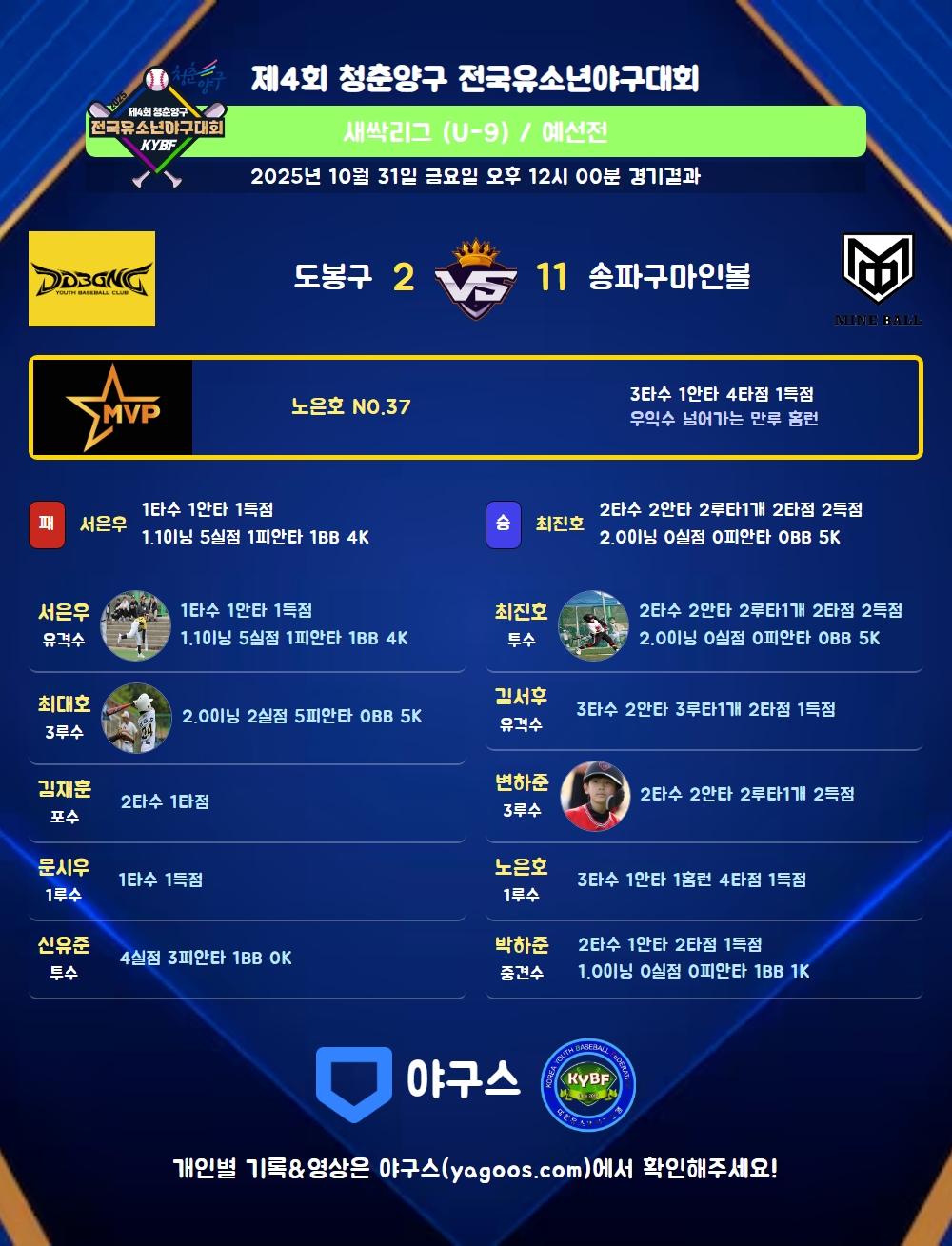 | 3 | 투 | 최진호(2) | 유내안 | - | 4구 | 우중2(2타점) | 2 | 2 | 2 | 2 | - | - | 1 | - | 1.000 |