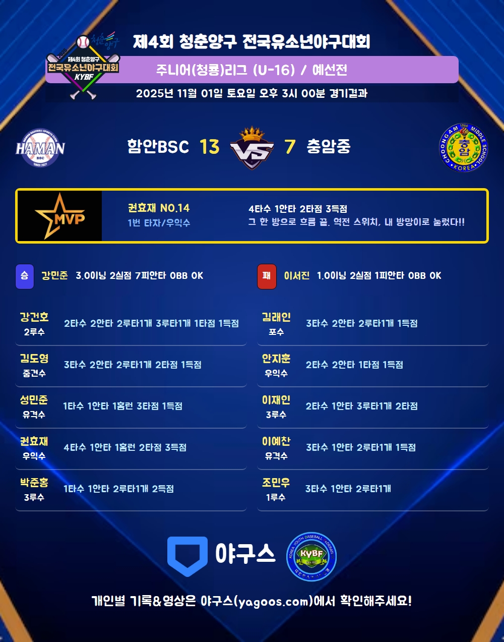 | 함안BSC | 1 | 0 | 4 | 3 | 5 | 0 | 13 | 7 | 3 | 7 | 2 |