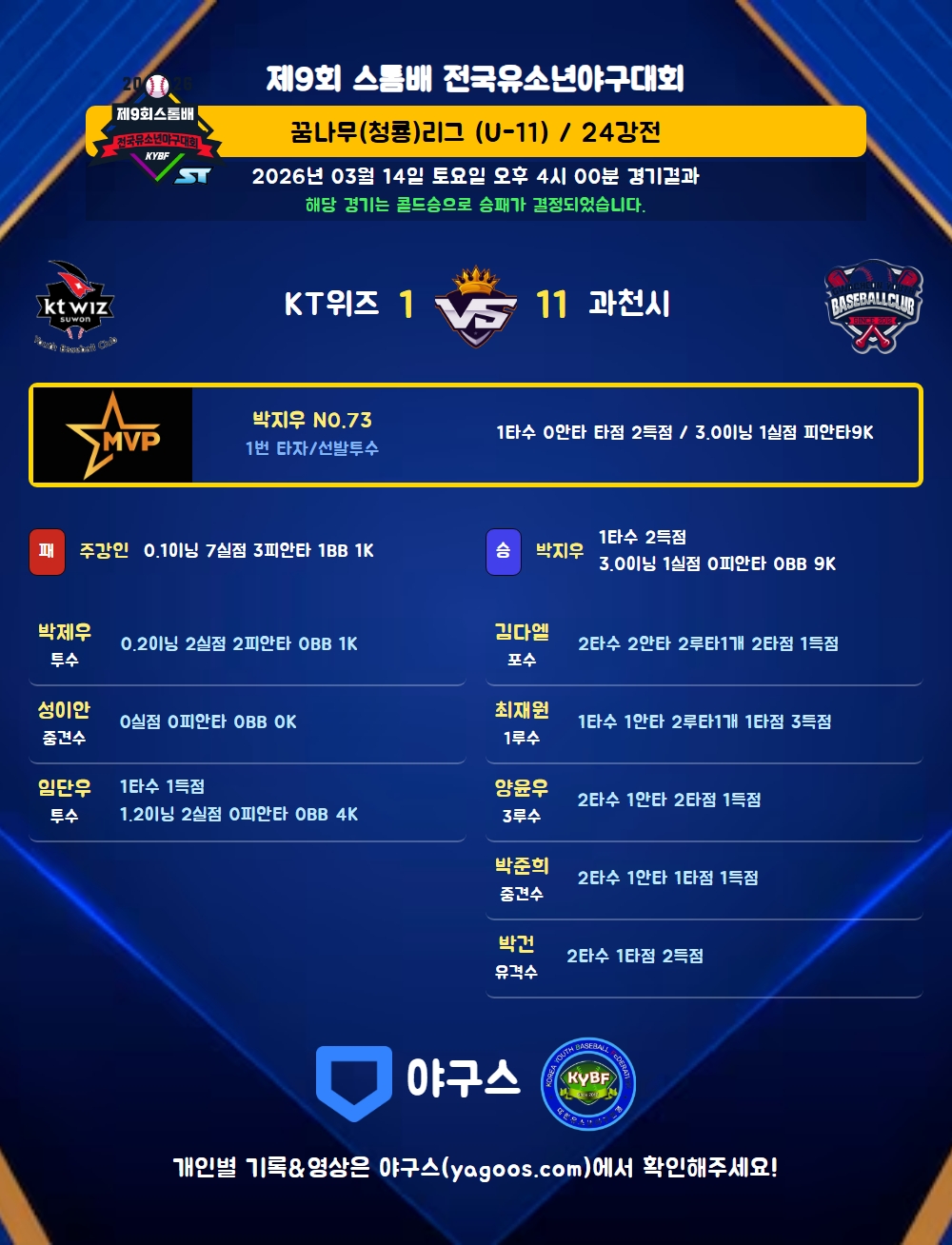 | 1 | 박지우(73) | 승 | 3.0 | 14 | 10 | - | - | 4 | 9 | 44 | 1 | - | 0 |