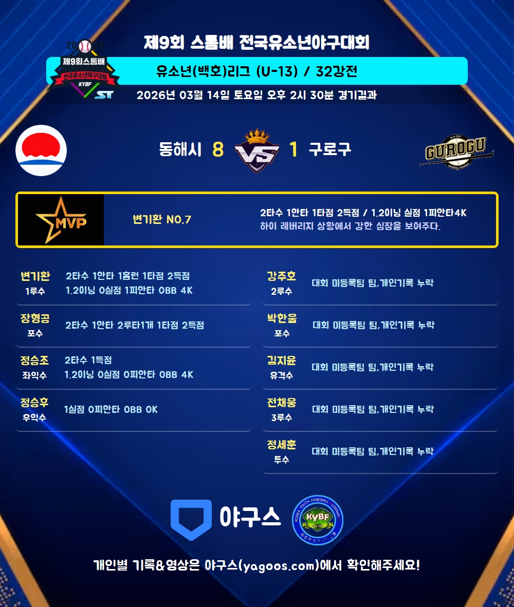 | 1 | 一 | 변기환(7) | 4구 | 삼진 | - | 우선G홈(1타점) | - | 2 | 1 | 1 | 2 | 1 | 2 | 1 | 1 | 0.500 |
