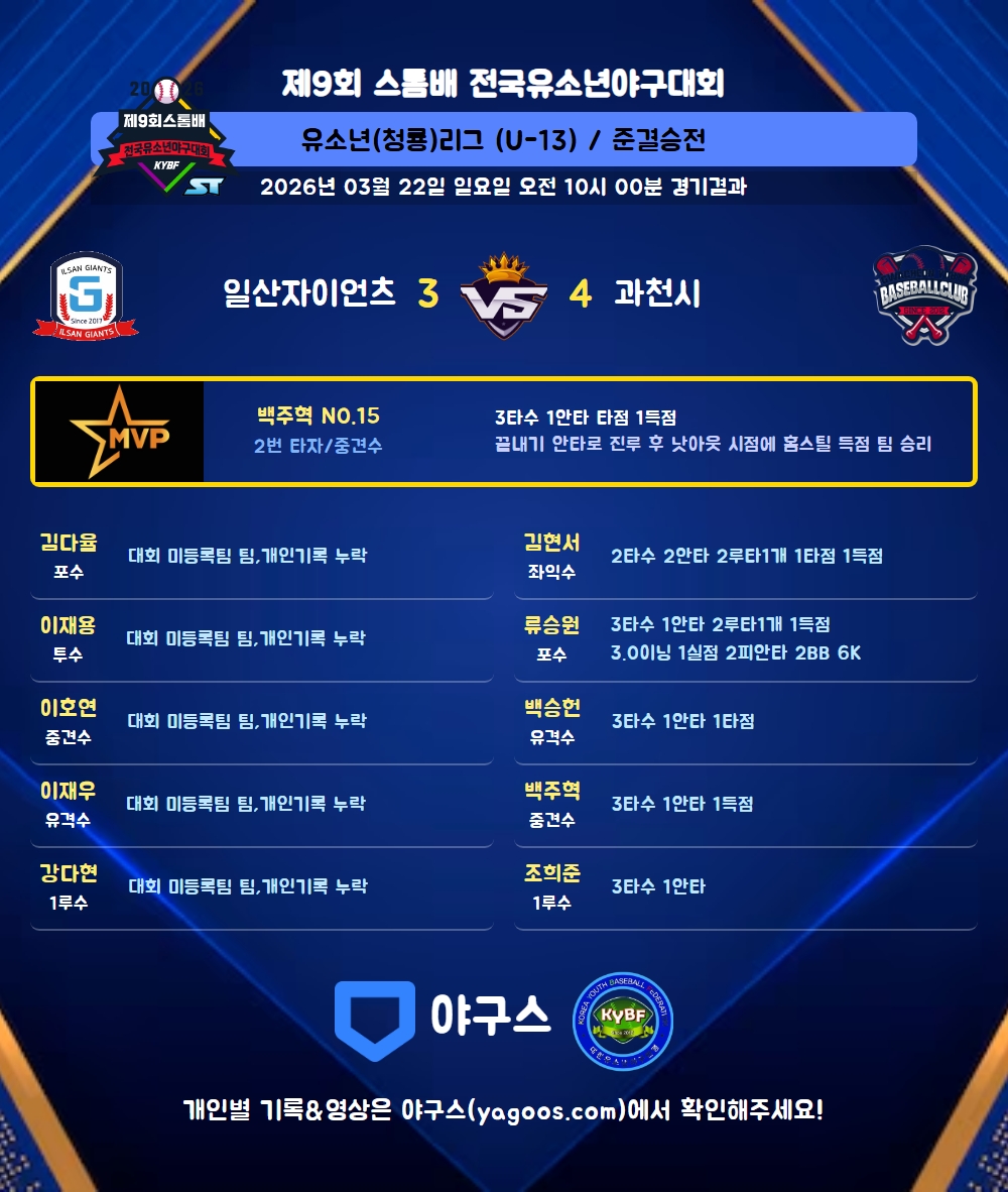 | 일산자이언츠 | 0 | 0 | 1 | 0 | 2 | 0 | 3 | 7 | 0 | 6 | 8 |