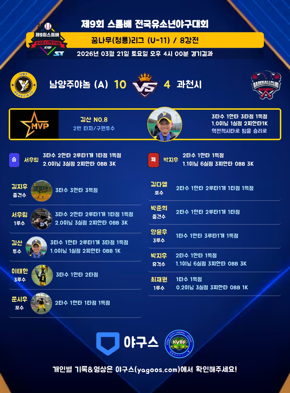 | 2루타 | 김산(8) 서우림(99) 김다엘(36) 박준희(17) |