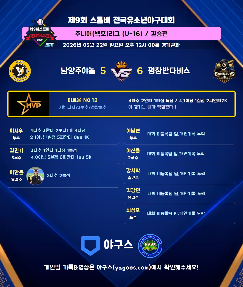 | 평창반다비스 | 2 | 0 | 3 | 0 | 0 | 0 | 1 | 6 | 11 | 0 | 5 | 6 |