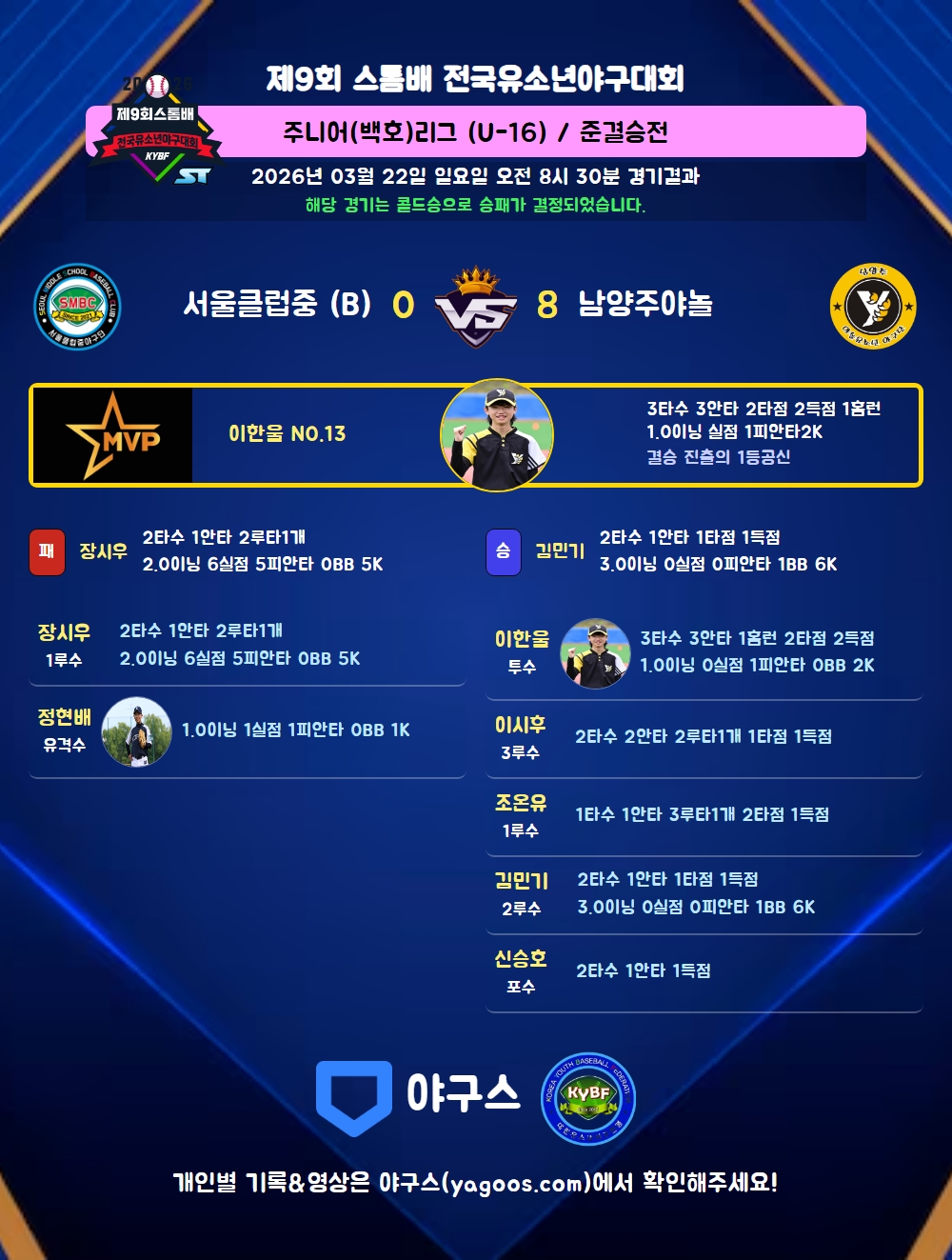| 2 | 투 | 이한울(13) | 중안(1타점) | 좌월G홈(1타점) | - | 좌안 | 3 | 3 | 2 | 2 | 1 | - | - | - | 1.000 |