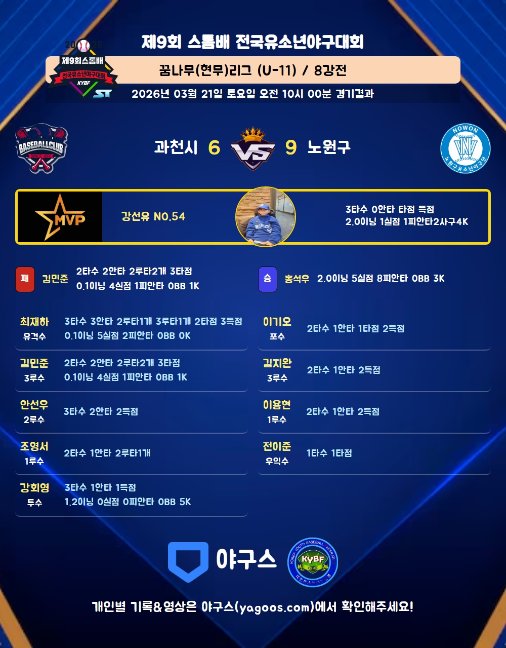 | 2루타 | 최재하(8) 김민준(99) 조영서(7) |