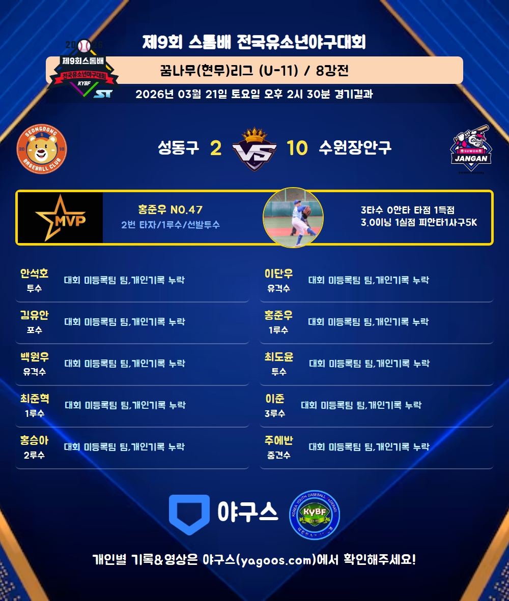 | 7 | 유 | 김성빈(11) | 대회 미등록팀 팀 / 개인기록 누락 | |||||||||||||||||||