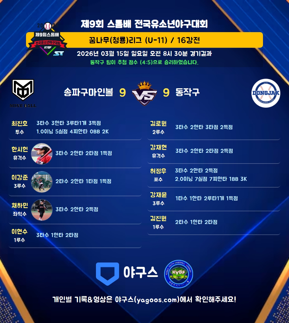 추첨점수로 승리하였습니다. (경기점수 9:9)