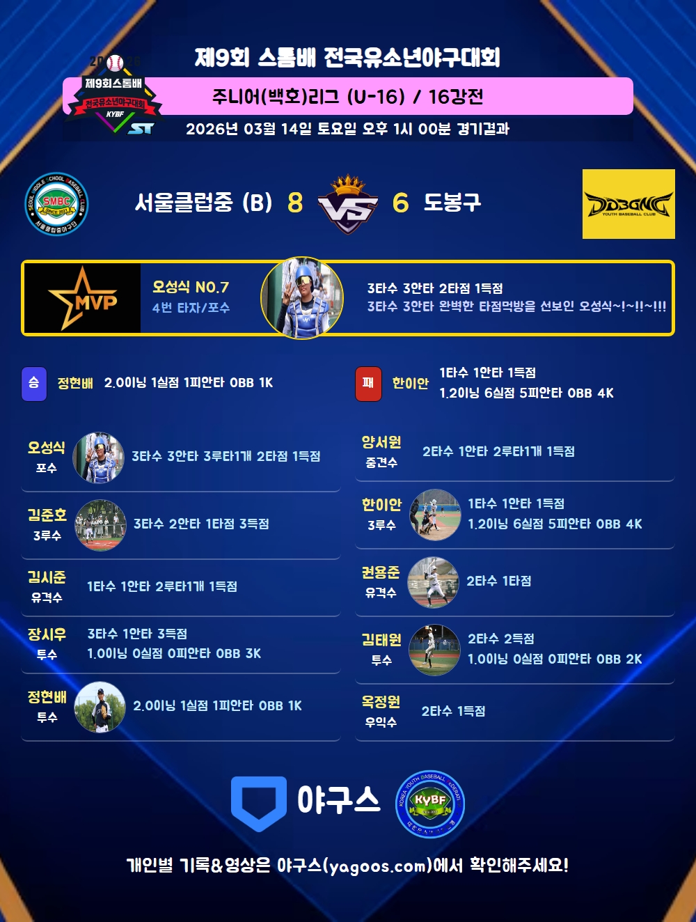 | 6 | 중 | 정지호(16) | 유땅출 | - | 2땅 | - | 삼진 | - | 3 | 0 | - | - | - | - | - | 1 | 0.000 |