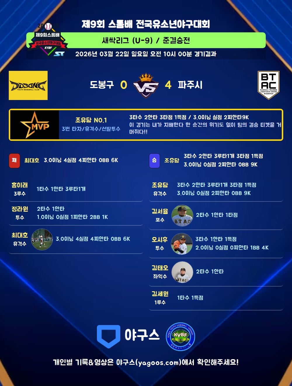 | 1 | 조유담(1) | 승 | 3.0 | 11 | 11 | 2 | - | - | 9 | 47 | - | - | 0 |