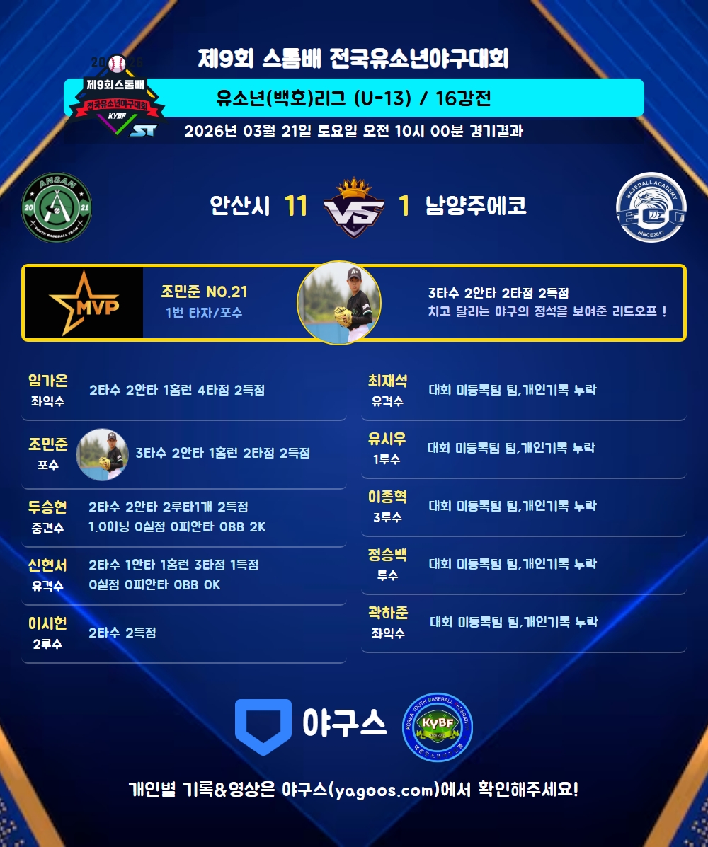 | 1 | 포 | 조민준(21) | 중안/중월G홈(2타점) | - | 우플 | - | 3 | 2 | 2 | 2 | 1 | 1 | - | - | 0.667 |