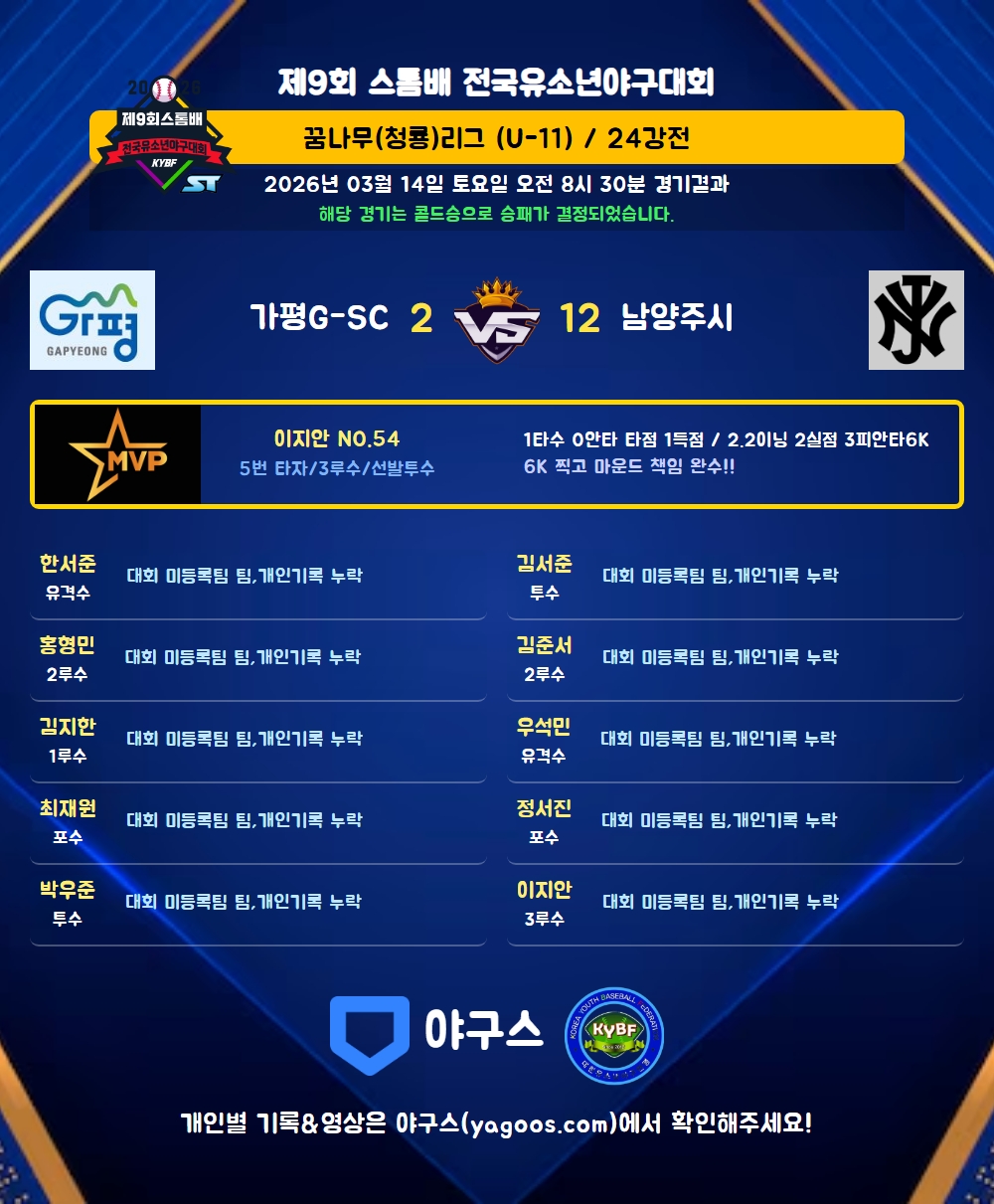| 3 | 一 | 김지한(12) | 대회 미등록팀 팀 / 개인기록 누락 | |||||||||||||||||||