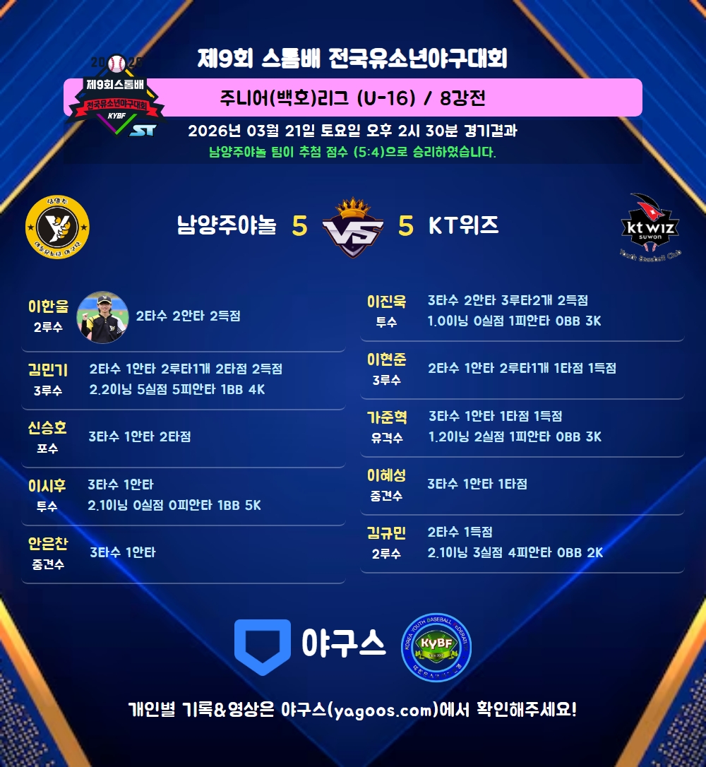 | 2 | 유 | 가준혁(17) | 삼진 | - | 투번안(1타점) | 유실 | - | - | 3 | 1 | 1 | 1 | - | 2 | - | 1 | 0.333 |