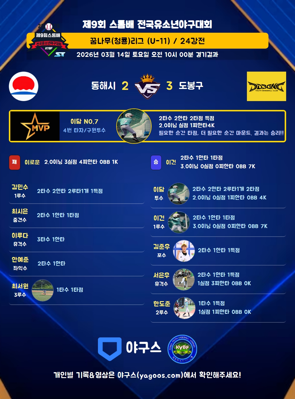 | 3 | 포 | 김준우(18) | 중안 | - | 2땅 | - | - | 2 | 1 | - | 1 | - | 1 | - | - | 0.500 |