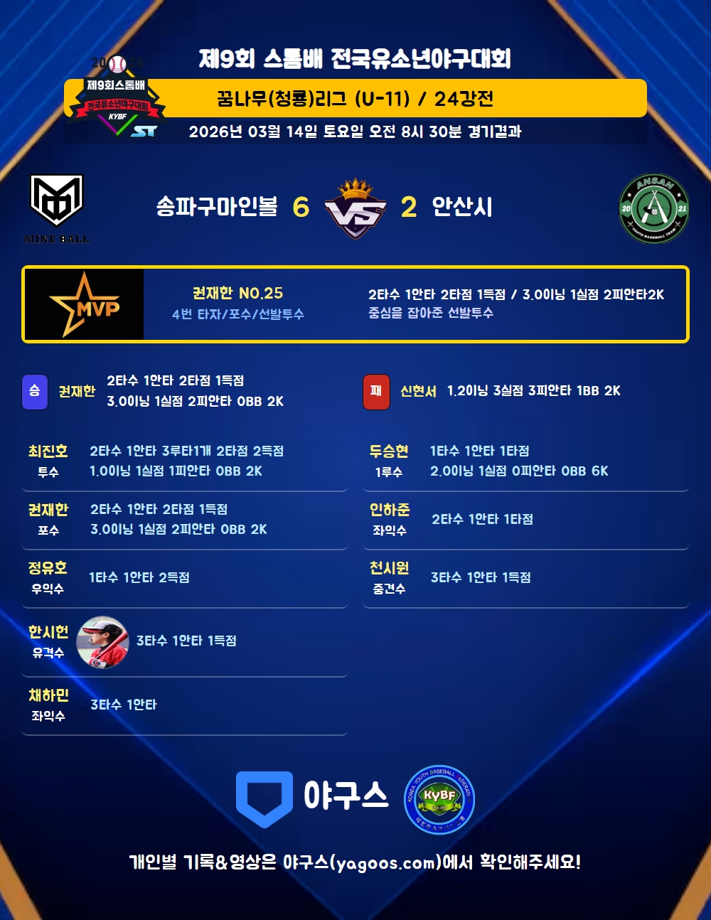 | 8 | 좌 | 인하준(99) | - | 투땅 | - | 우안(1타점) | - | 2 | 1 | 1 | - | - | 1 | - | - | 0.500 |