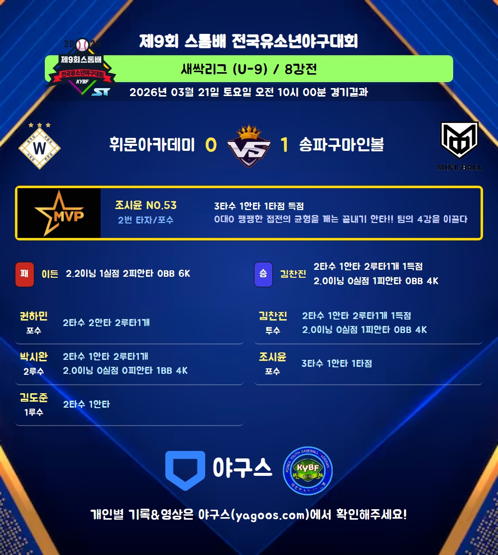| 2 | 포 | 조시윤(53) | 삼진 | - | 1땅 | - | 우월안(1타점) | 3 | 1 | 1 | - | - | - | - | 1 | 0.333 |