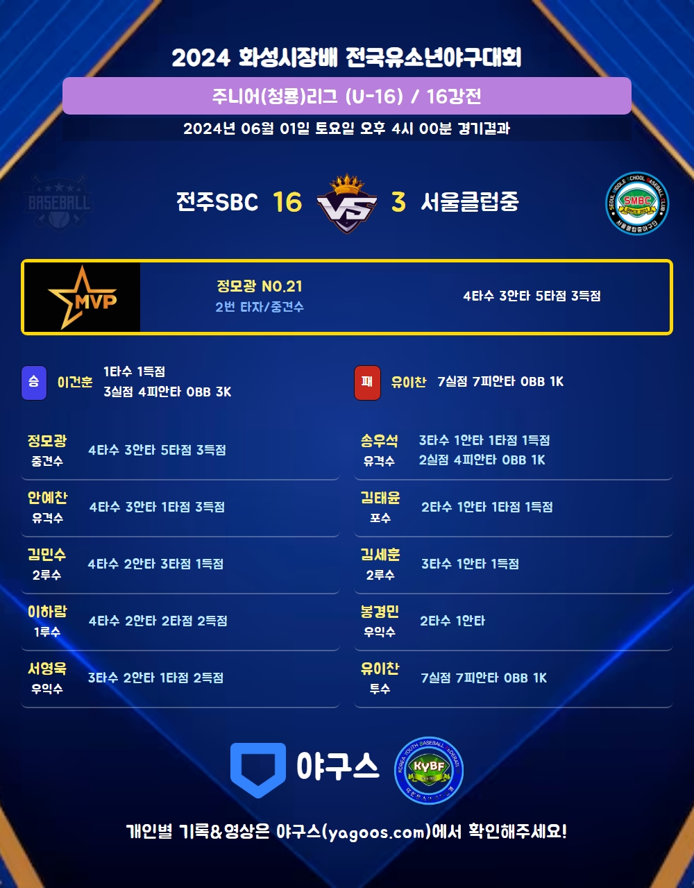| 2 | 중 | 정모광(21) | 우전안 | 우월3 | - | 1땅 | 우전안 | - | 4 | 3 | 5 | 3 | 0 | 0 | - | 0 | 0.750 |