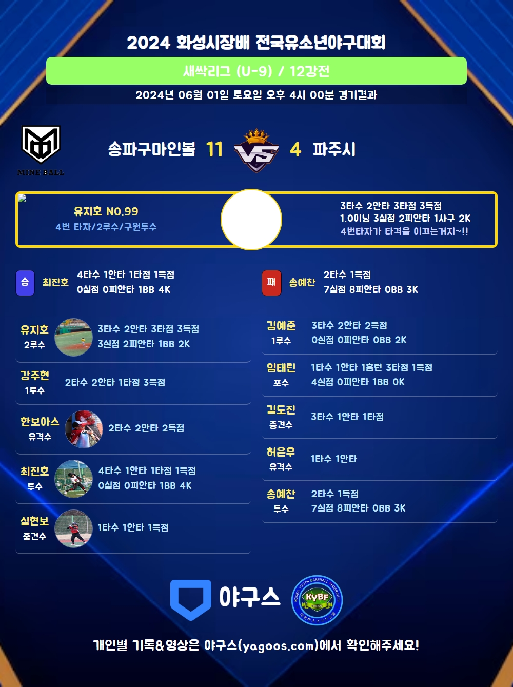 | 1 | 一 | 김예준(31) | 투땅 | - | 좌전안 | 중전2 | 3 | 2 | 0 | 2 | 0 | 0 | - | 0 | 0.667 |