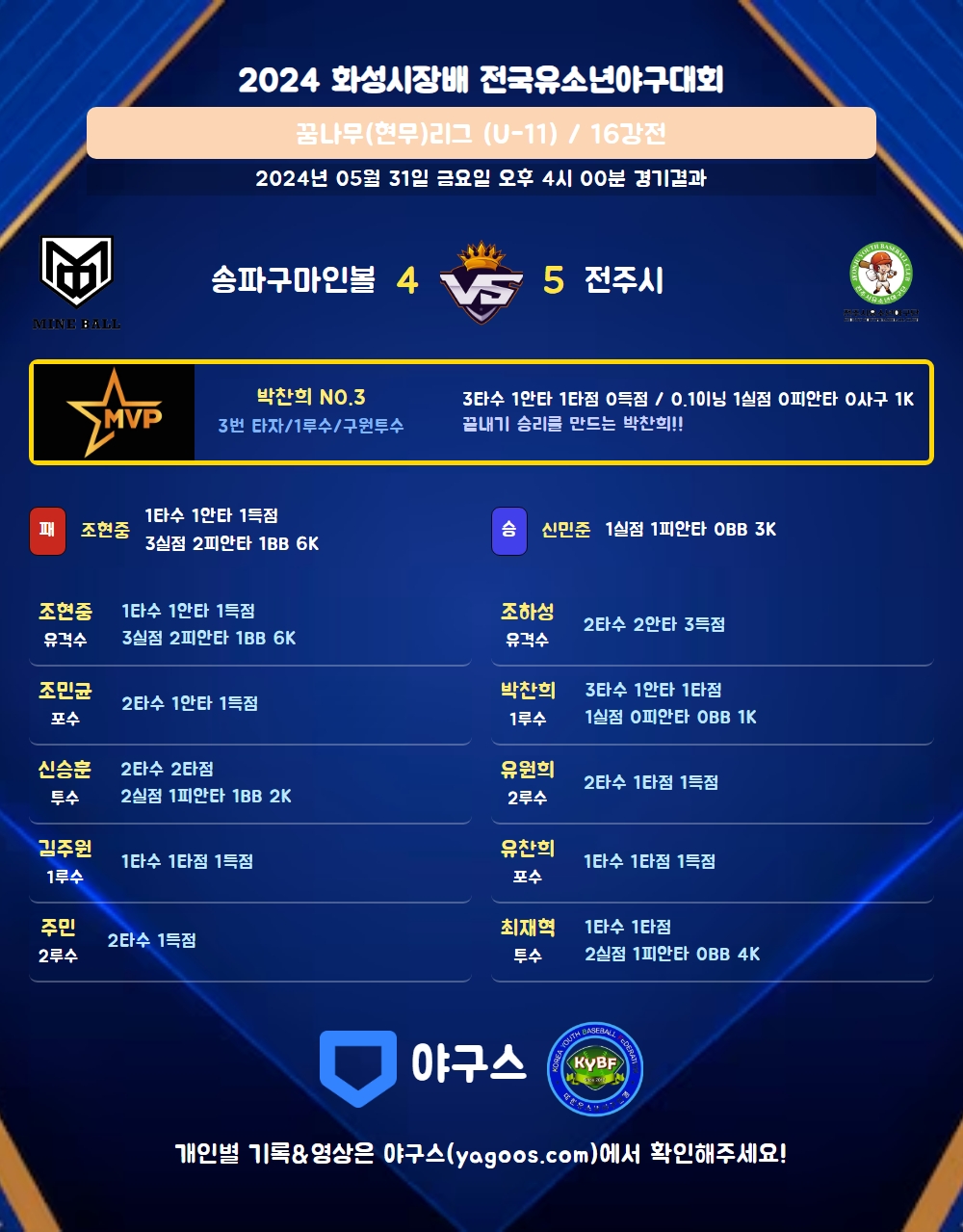 | 5 | 포 | 유찬희(18) | 유땅 | - | 사구 | - | 1 | 0 | 1 | 1 | 0 | 1 | 1 | 0 | 0.000 |