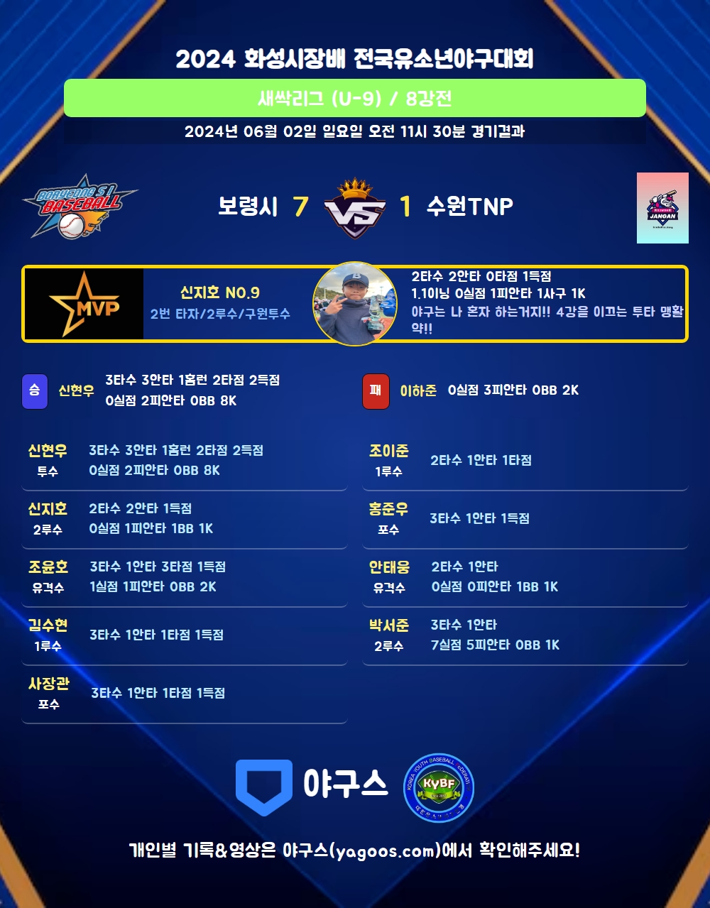 | 5 | 포 | 홍준우(47) | 삼진 | - | - | 유내안 | 투땅 | - | 3 | 1 | 0 | 1 | 0 | 0 | - | 1 | 0.333 |