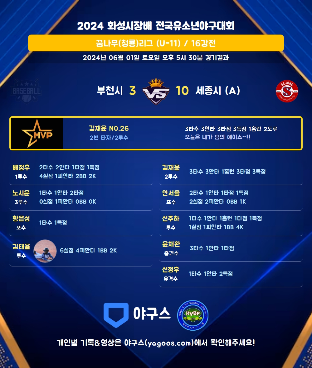 | 5 | 三 | 노시윤(29) | 4구 | - | 유내2 | 1 | 1 | 2 | 0 | 0 | 1 | 1 | 0 | 1.000 |