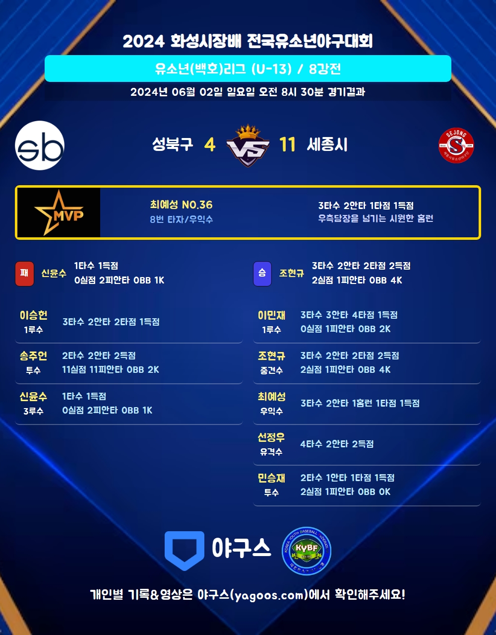 | 9 | 투 | 민승재(34) | - | 2땅 | 중전안 | - | - | 2 | 1 | 1 | 1 | 0 | 0 | - | 0 | 0.500 |