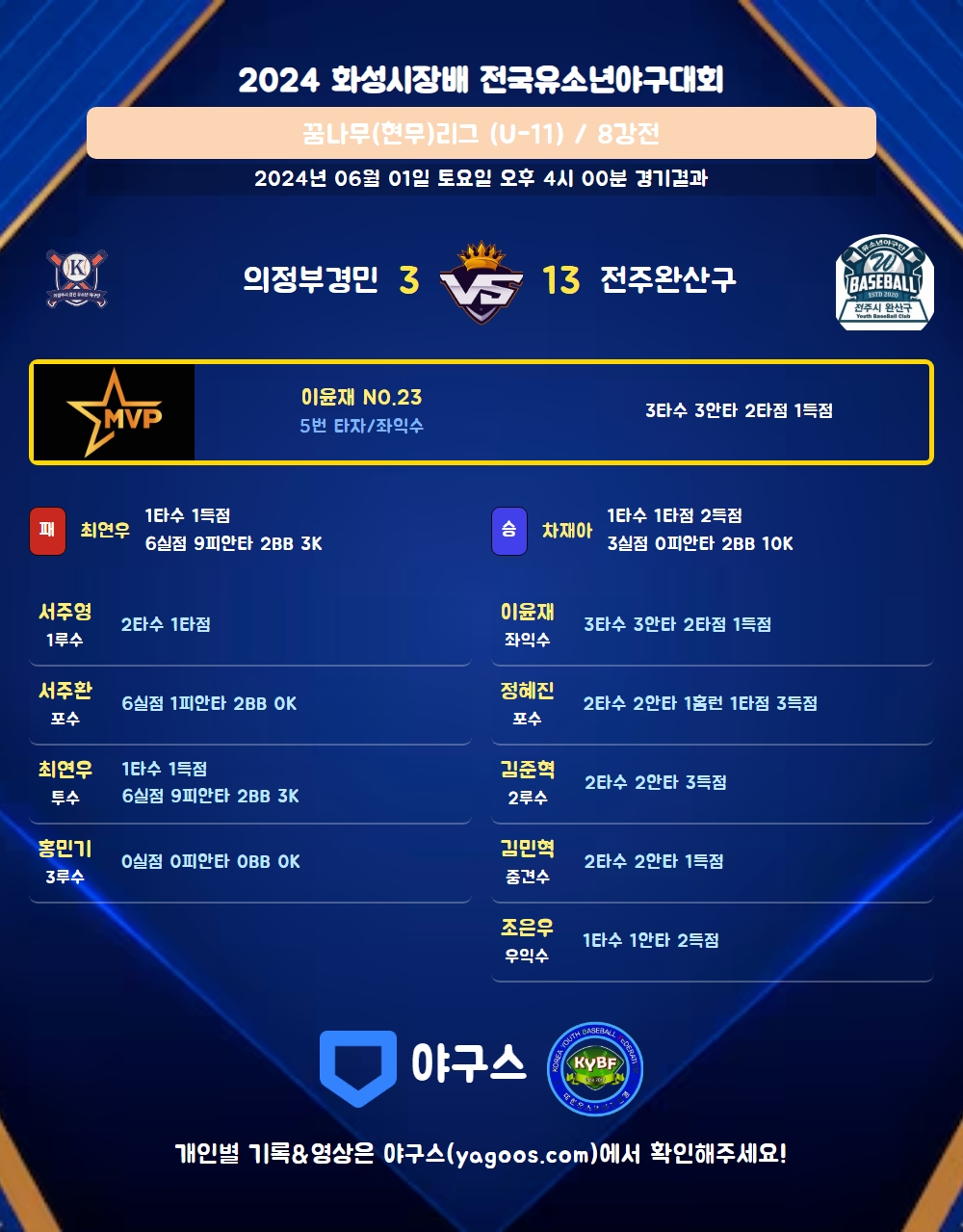 | 1 | 차재아(25) | 승 | - | 14 | 0 | 0 | 0 | 4 | 10 | 56 | 3 | 3 | 500.00 |