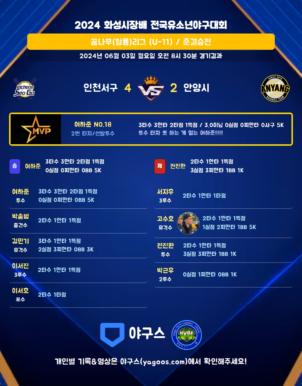 | 2 | 투 | 여하준(18) | 좌전3 | 좌월2 | - | 중전안 | - | 3 | 3 | 2 | 1 | 0 | 1 | - | 0 | 1.000 |