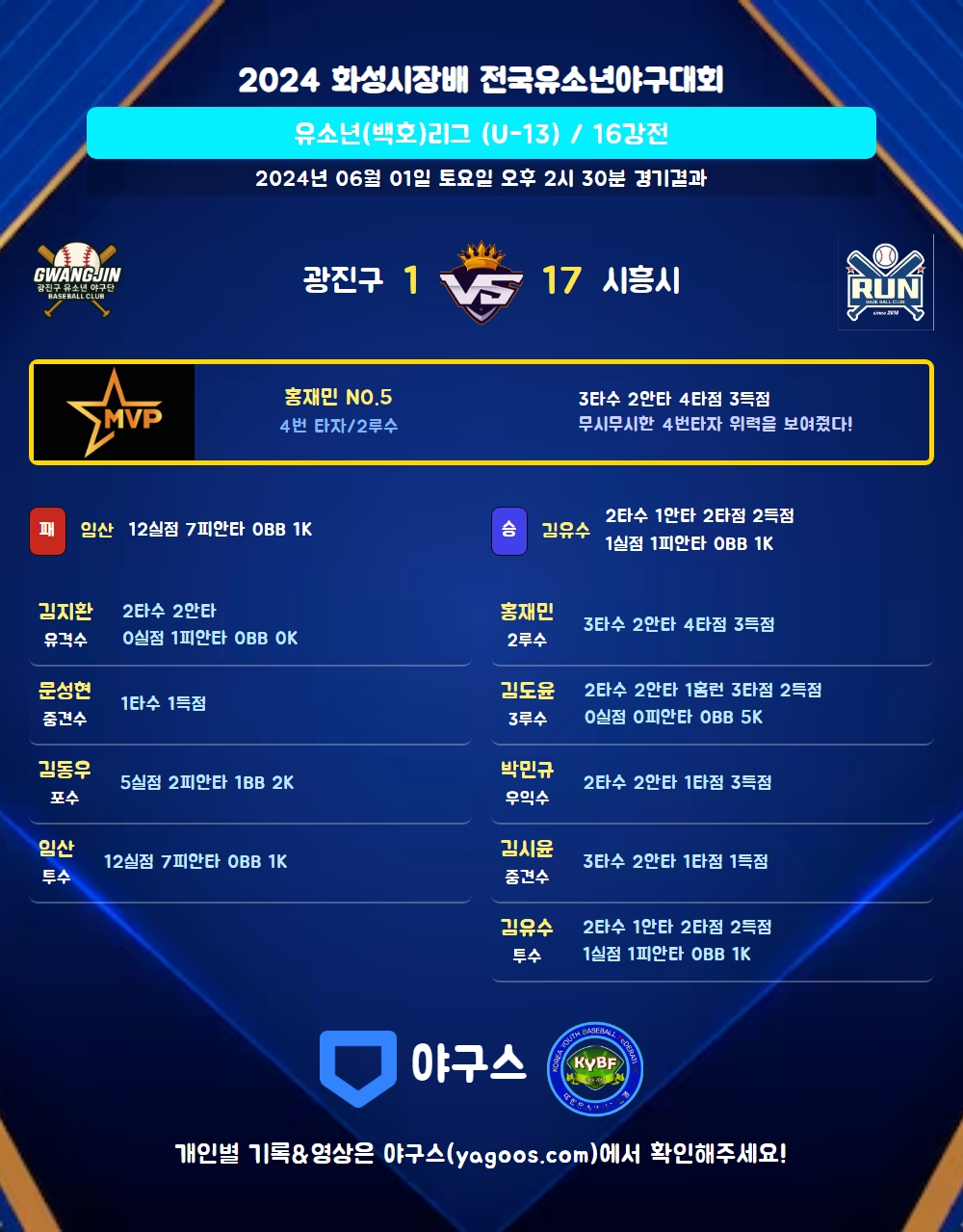 | 1 | 김유수(16) | 승 | - | 4 | 1 | 1 | 0 | 2 | 1 | 20 | 1 | 1 | 900.00 |