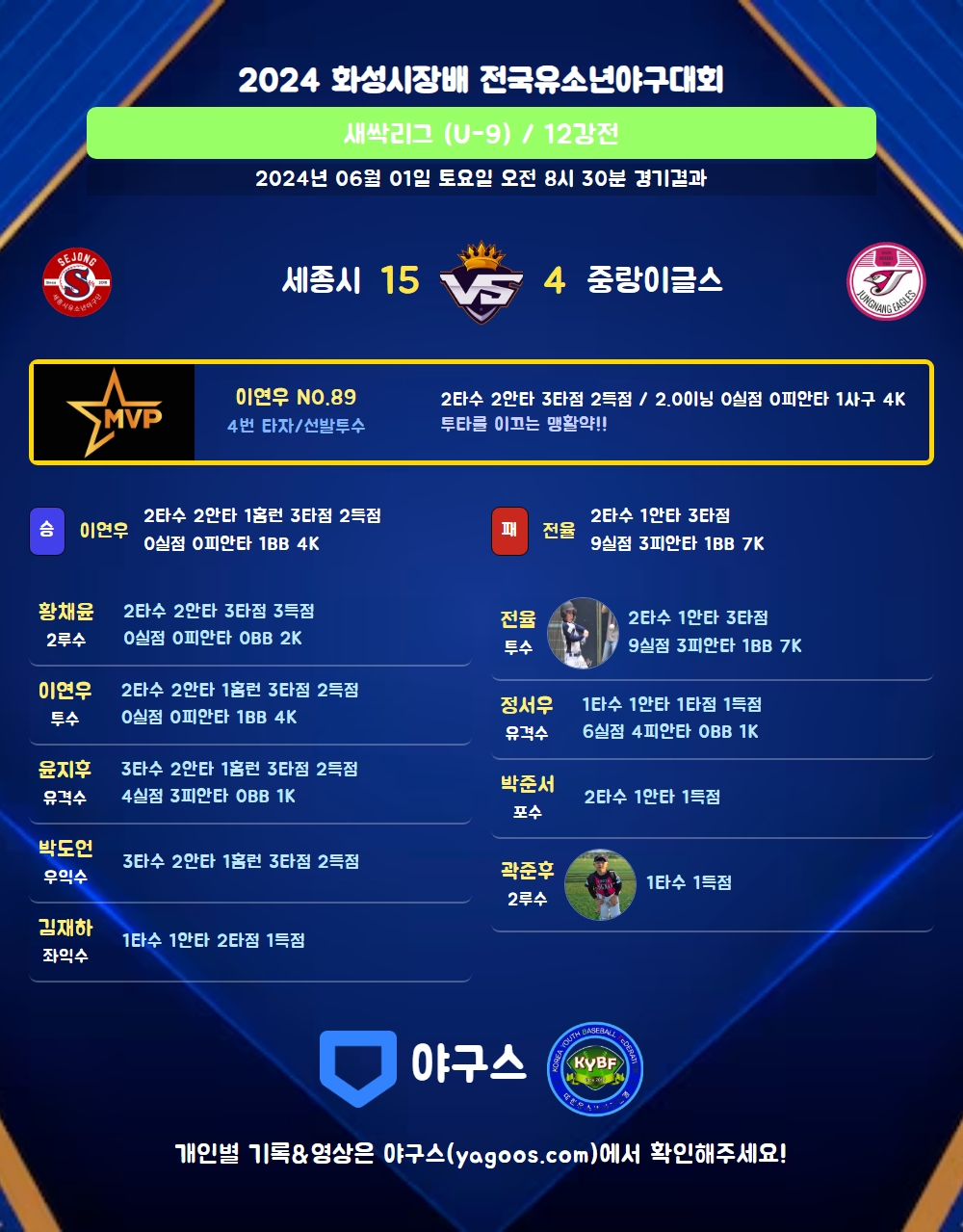 | 5 | 三 | 황예준(12) | - | 사구 | 4구 | 0 | 0 | 0 | 0 | 0 | 0 | 2 | 0 | 0.000 |
