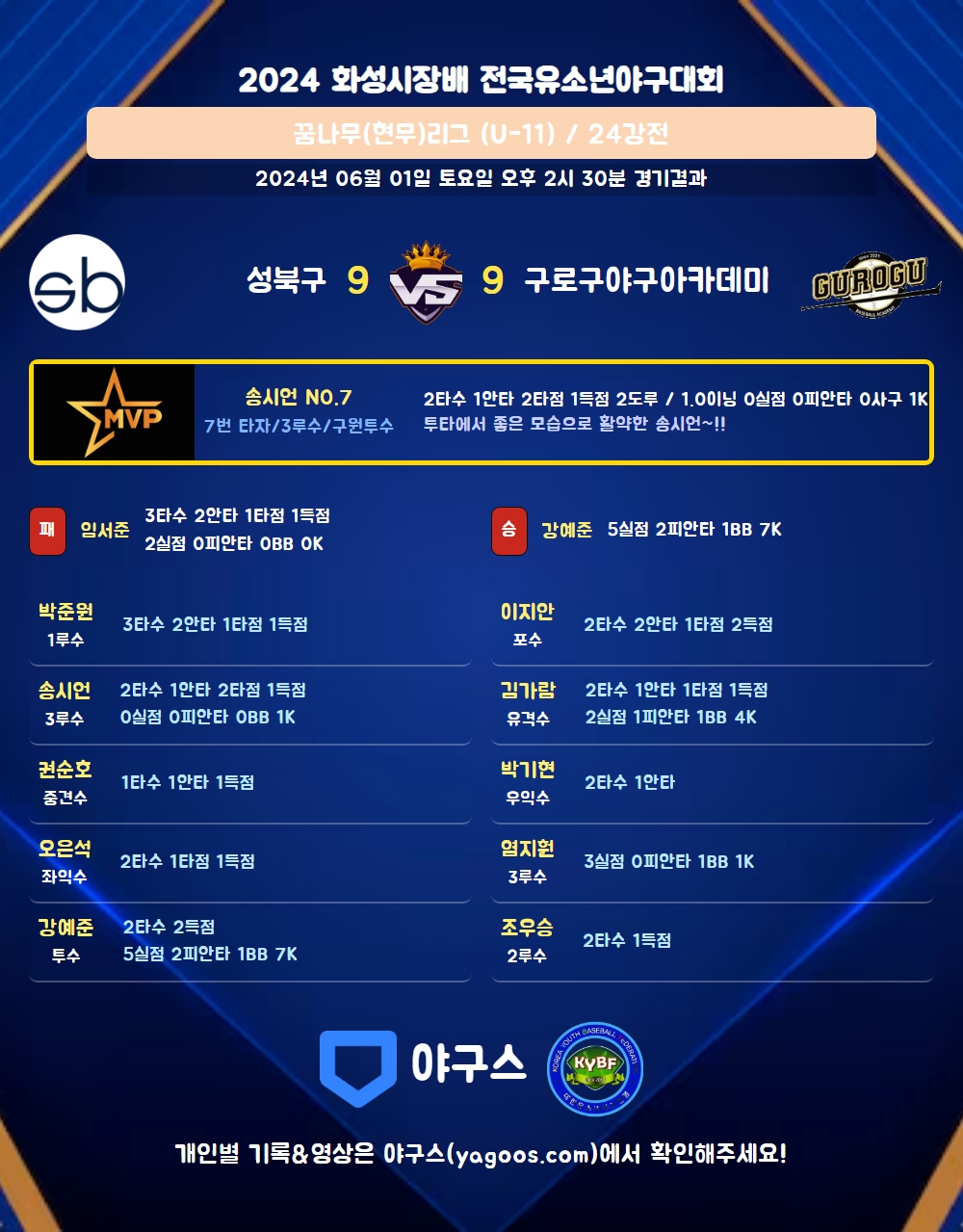 | 구로구야구아카데미 | 2 | 0 | 3 | 0 | 4 | 9 | 4 | 1 | 9 |
