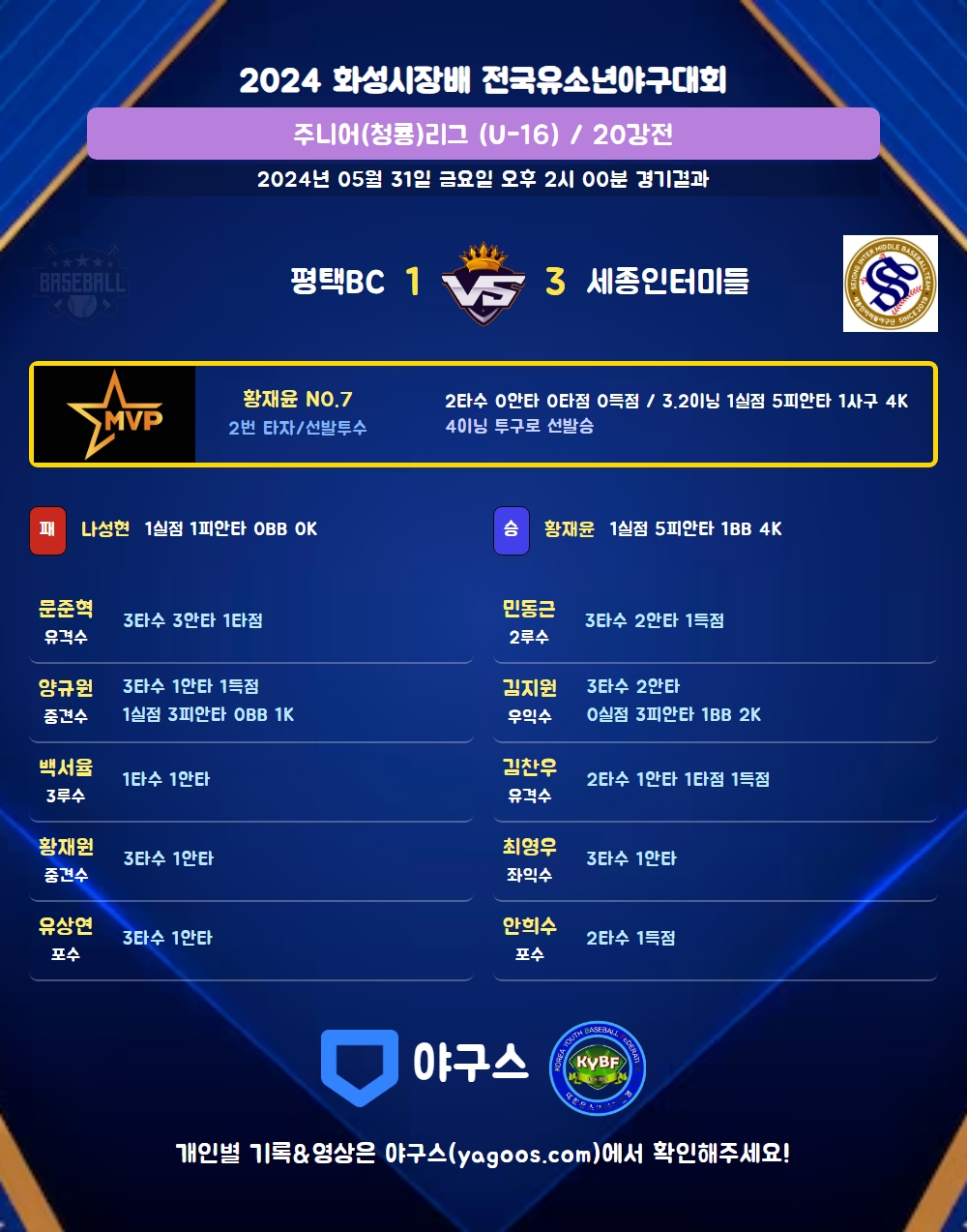 | 4 | 좌 | 최영우(16) | 우플 | - | 좌전안 | - | 낫아웃(폭투) | - | - | 3 | 1 | 0 | 0 | 0 | 0 | - | 1 | 0.333 |