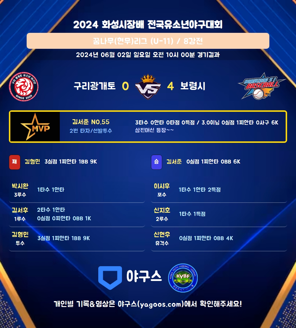 | 1 | 김서준(55) | 승 | - | 10 | 1 | 1 | 0 | - | 6 | 35 | 0 | 0 | 0.00 |