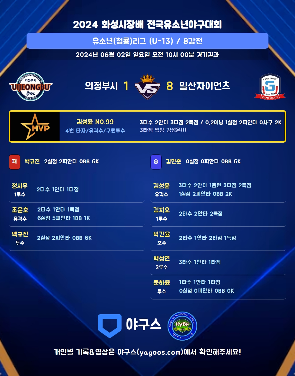 | 일산자이언츠 | 2 | 0 | 0 | 0 | 6 | 8 | 8 | 1 | 3 |