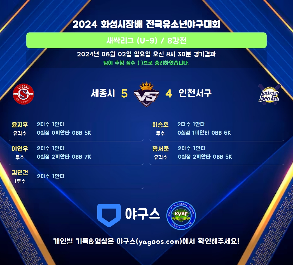 | 2 | 유 | 황서준(23) | 유내안 | - | 3땅 | - | - | 2 | 1 | 0 | 0 | 0 | 0 | - | 0 | 0.500 |