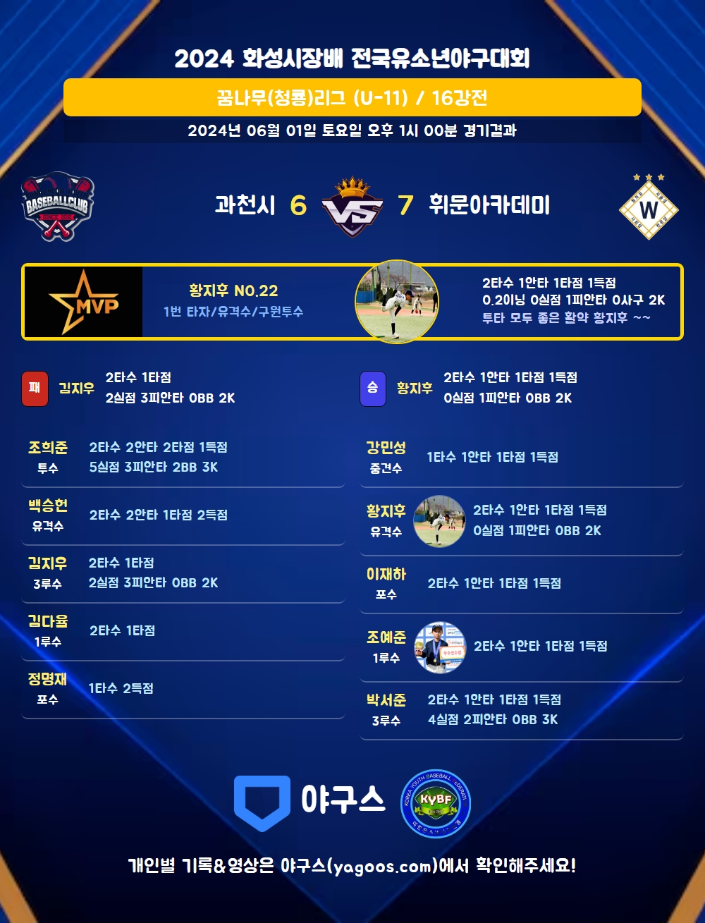 | 1 | 유 | 황지후(22) | 유플 | 중월3 | - | - | 2 | 1 | 1 | 1 | 0 | 0 | - | 0 | 0.500 |