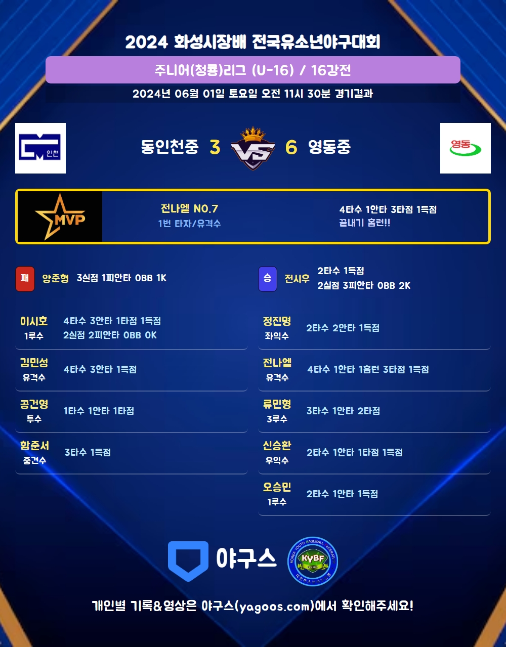 | 4 | 三 | 류민형(16) | - | 3땅 | - | 삼진(낫아웃) | - | 좌월3 | - | 3 | 1 | 2 | 0 | 0 | 0 | - | 1 | 0.333 |