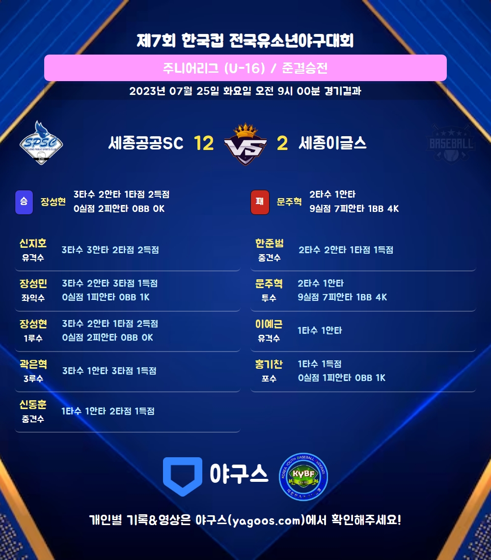 | 세종이글스 | 2 | 0 | 0 | 2 | 4 | 2 | 2 |